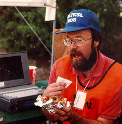 Anyway, in this picture Libby is sitting on and hooked up to my almost invisible PK232 TNC (Terminal Node Controller, fancy HAM-Radio lingo for a radio Modem [Modulator/Demodulator, fancy computer lingo for a gizmo {fancy technical term meaning "thing"} that converts between computer zeros and ones and telephone/radio sounds to allow information to be transfered between computers]), ready for a little Packet Radio work (except I think they're both turned off, so it's not really ready).